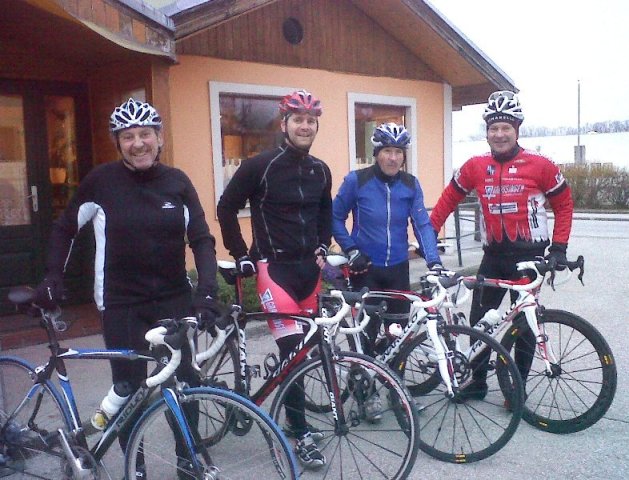Trotzdem standen gestern bei der Premiere mit Joel Hendrix, Harald Mahringer, Franco Dettori (Arbeitskollege aus der Rotax) und Ames 4 Radler am Start am Marktplatz in Lambach. Es wurde eine 35km Runde mit 210 Höhenmeter in Angriff genommen. Nach 1 Stunde und 35 Min und einem gefahrenen Schnitt von 22km/h war man dann rechtzeitig am Clubabend beim Leingartner in Lambach. Schnell wurde noch ein Foto gemacht und dann rein in die warme Stube, weil a bisserl durchgefroren waren wir schon. Aber bei einer halben Bier bzw. Most gspritzt
